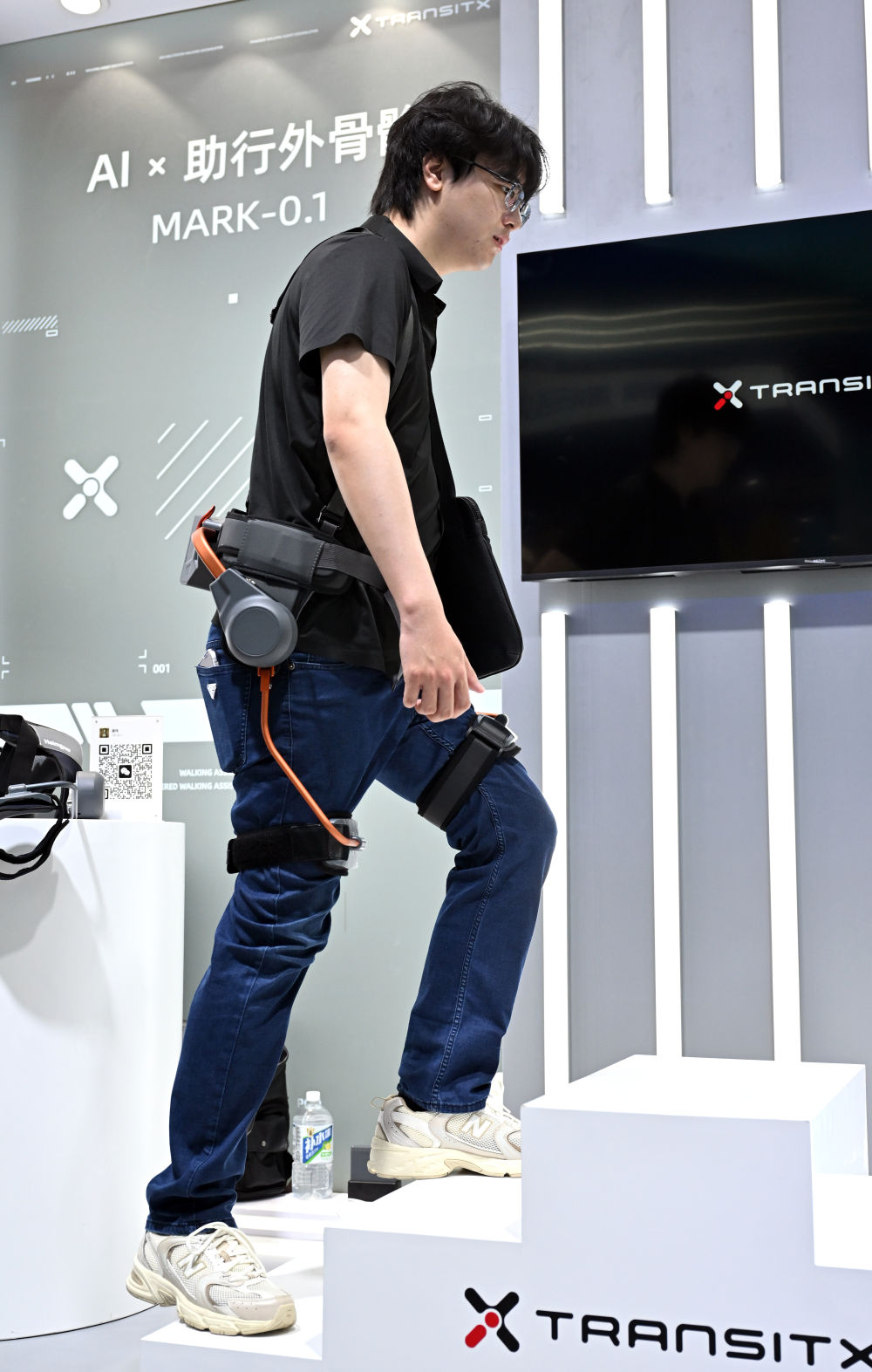 ↑ 4月14日,参观者在第六届消博会现场体验一款AI助行外骨骼。新华社记者 郭程 摄