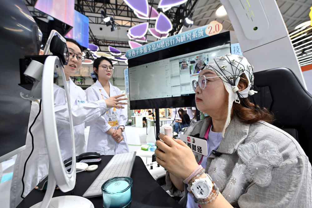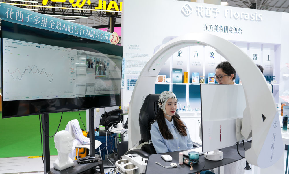 ↑ 4月14日,展商在消博会现场展示美妆多维全息AI感官行为研究系统。新华社记者 郭程 摄
