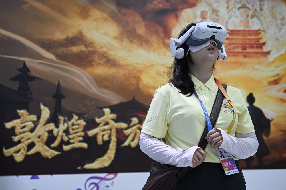 ↑ 4月14日,观众在第六届消博会现场体验VR项目《敦煌奇旅》。新华社记者 蒲晓旭 摄