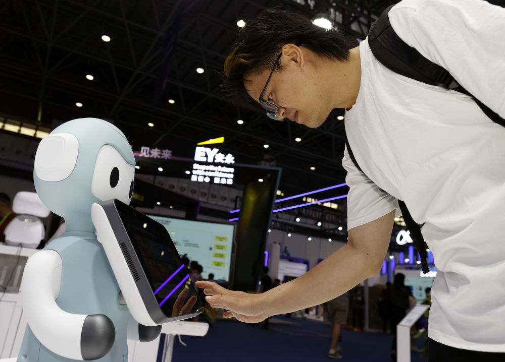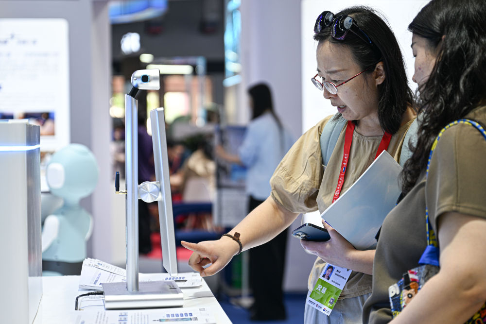 ↑ 4月14日,参观者在第六届消博会现场观看AI陪伴机器人。新华社记者 郭程 摄