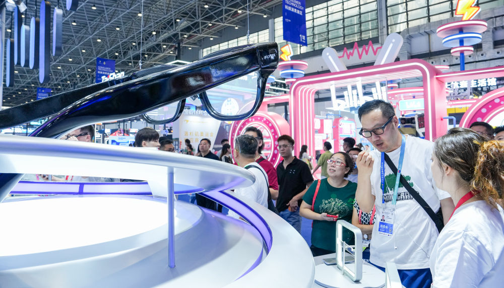 ↑ 4月14日,观众在第六届消博会科技消费展区了解科大讯飞的AI眼镜产品。新华社记者 杨冠宇 摄
