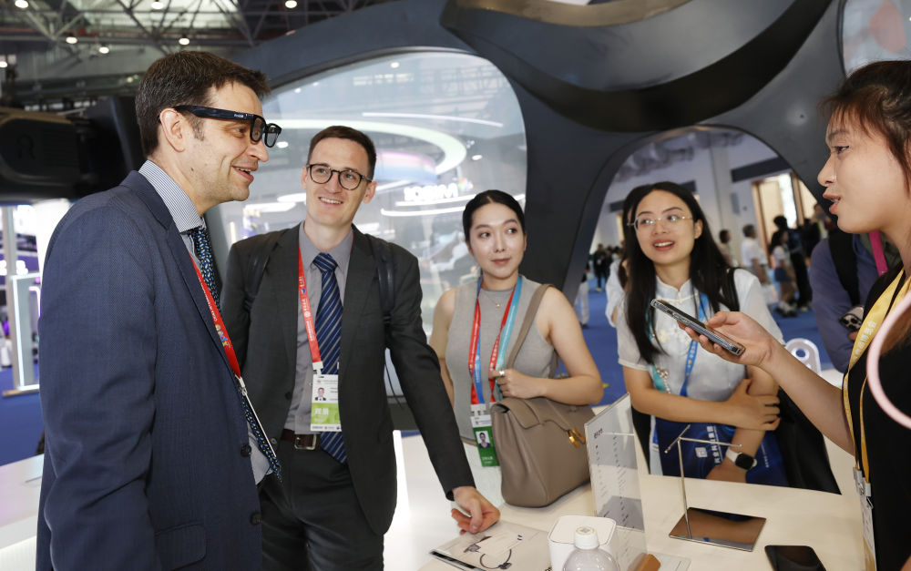 ↑ 4月14日,在第六届消博会科技消费展区,人们在乐奇展台了解AI眼镜。新华社记者 高静 摄