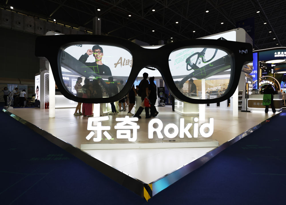 ↑ 4月14日,在第六届消博会科技消费展区,人们参观智能眼镜品牌乐奇展台。新华社记者 高静 摄