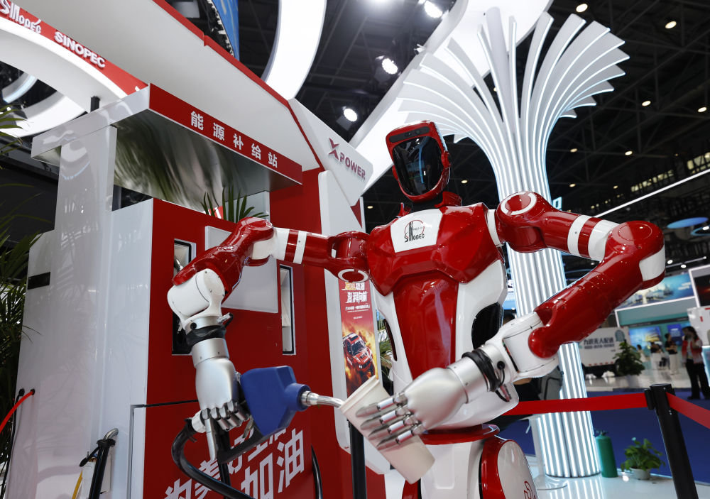 ↑ 4月14日,在第六届消博会科技消费展区,中国石化展台展示机器人加油。新华社记者 高静 摄