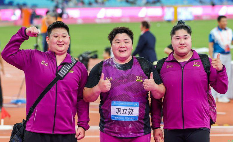 2025年11月16日,河北运动员马越、巩立姣、张林茹(从左至右)在第十五届全运会田径女子铅球决赛赛后庆祝胜利。河北日报记者耿辉摄