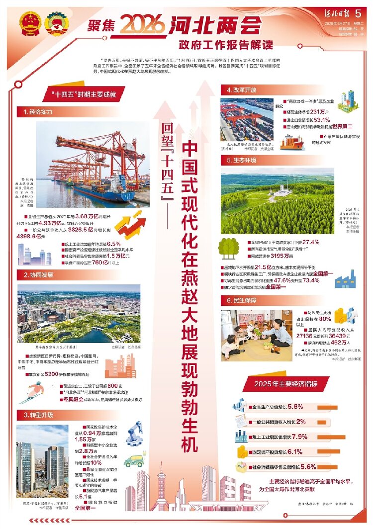“过去五年,是极不寻常、极不平凡的五年。”1月26日,省长王正谱在省十四届人大四次会议上所作的政府工作报告中,全面回顾了五年来全省经济社会各领域取得的成就。我省圆满完成“十四五”规划目标任务,中国式现代化在燕赵大地展现勃勃生机。