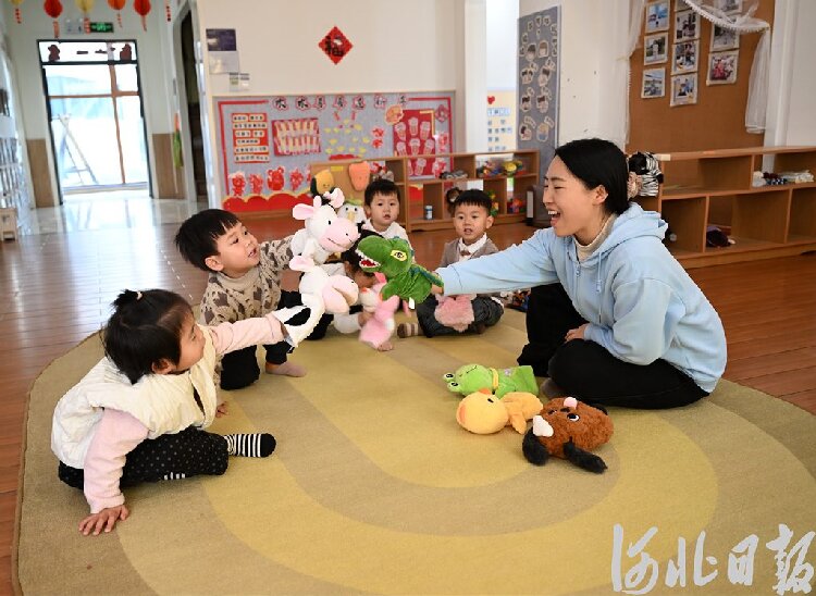近日,邢台市南和区小博士第三幼儿园托育班,保育师带领孩子们做游戏。河北日报记者赵永辉摄