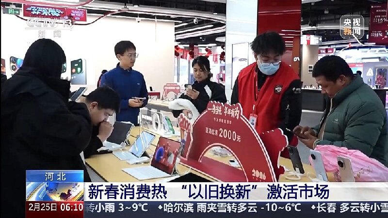2月25日,央视新闻频道播发《河北:新春消费热 “以旧换新”激活市场》。报道称,今年春节假期,河北组织开展了370余场“乐购新春”促销活动,各地家电、数码门店在国补基础上叠加多重优惠,有力拉动节日消费市场。在石家庄,不少商场迎来消费热潮,特别是智能眼镜首次被纳入数码产品国家补贴范围,吸引众多消费者下单。除国补外,许多门店还推出直降以及其他补贴,让消费者享受“折上折”实惠。据河北省商务厅统计,2月15日至22日,全省消费品“以旧换新”使用补贴资金1.37亿元,实现销售额11.19亿元,惠及经营主体1.92万家、消费者27万余人,河北新春消费市场呈现红火景象。