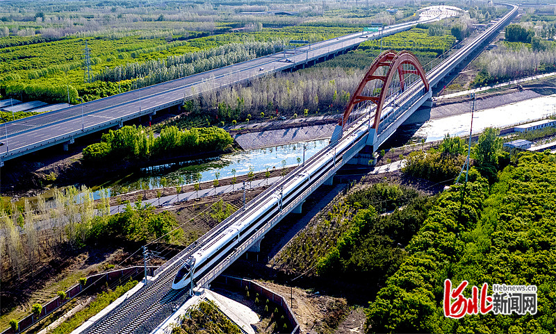 2025年5月3日,复兴号动车组列车驶过怀兴城际廊兴段跨龙河简支拱桥。河北日报记者 赵永辉摄
