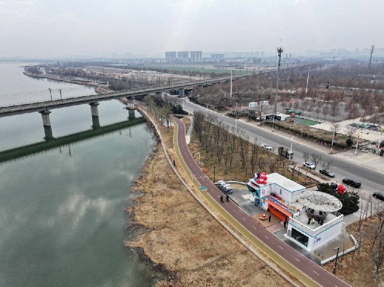 ↑这是石家庄市滹沱河沿线的环城绿道(12月10日摄,无人机照片)。