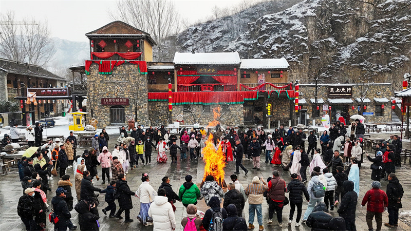 1月17日,易县恋乡·太行水镇,游客围绕篝火载歌载舞。