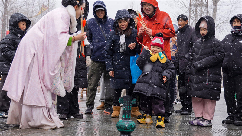 1月17日,游客在保定恋乡·太行水镇参与互动游戏。