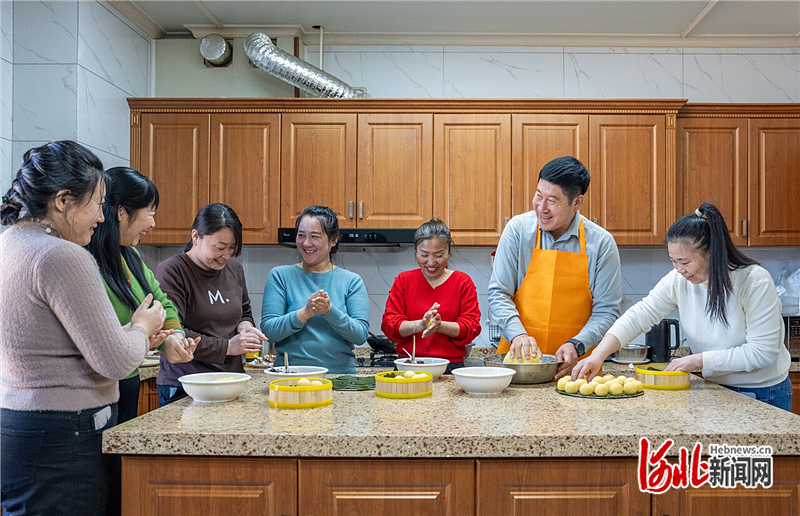 2月7日,张全利(右二)和家人、员工一起制作黏饽饽。河北日报记者 赵杰摄