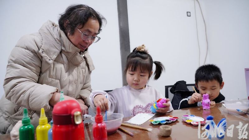 2月4日,在玉田二十四节气文化生活驿站,国家级非遗代表性项目——玉田泥塑传承人魏艳华,正在指导小朋友为泥塑敷彩。杨颖摄
