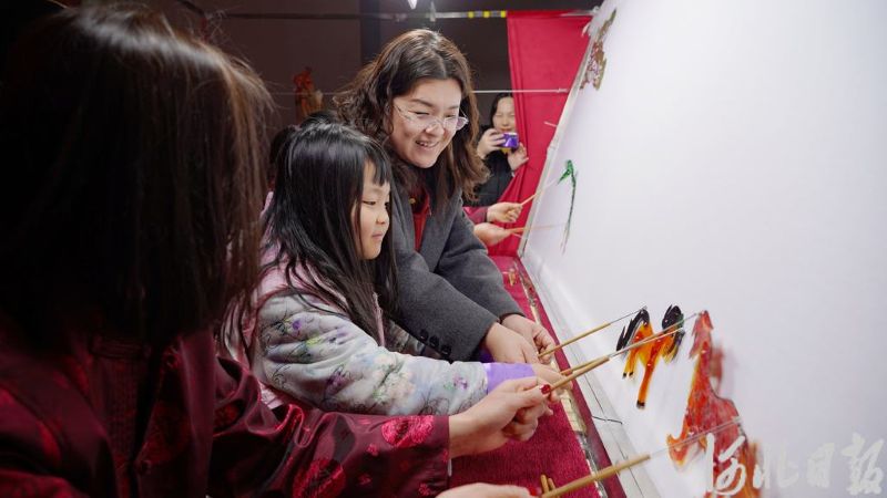 2月9日,在玉田二十四节气文化生活驿站,市民跟着老师学习皮影的律动技巧,感受耍皮影的快乐。杨颖摄