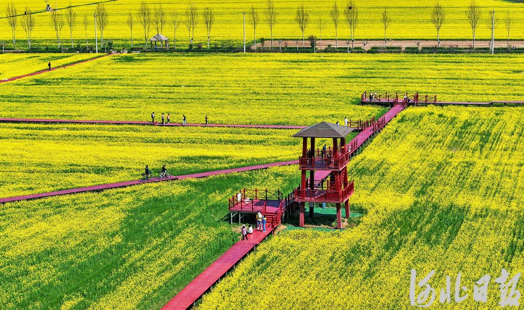 4月4日,游人在安平县杨屯村万亩油菜花海赏花踏青,感受春日之美。河北日报记者张昊摄