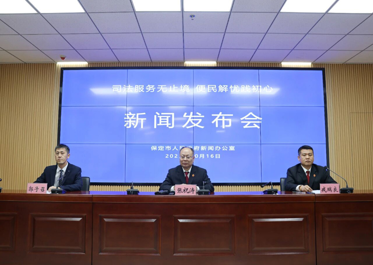 10月16日,保定市政府新闻办公室组织召开主题为“司法服务无止境 便民解忧践初心”的新闻发布会,保定市中级人民法院党组成员、副院长张祝涛等人员出席。