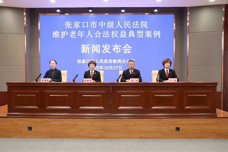 习近平总书记深刻指出:“有效应对我国人口老龄化,事关国家发展全局,事关亿万百姓福祉。”“一个社会幸福不幸福,很重要的是看老年人幸福不幸福。”10月27日上午,张家口市中级人民法院召开维护老年人合法权益典型案例新闻发布会,通报了5起涉老典型案例。市中院党组成员、副院长邢海丽参加发布会并回答记者问。长城新媒体、张家口日报、张家口电视台等媒体受邀参加。