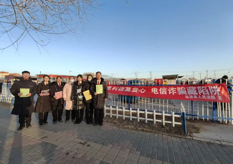 腊月廿六清晨,天色微明,沽源法院刑事庭的干警们已走进喧闹的早市。没有讲台桌椅,普法就在摊位旁、人流中——“面对面”就是最直接的方式。两名干警在市场入口处挂起醒目的条幅:“高息利诱莫贪心,电信诈骗藏陷阱”,其余干警则手持宣传册,径直走向熙攘的人群。