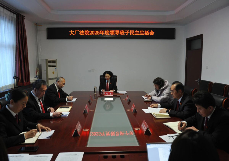 按照省市县委关于开好2025年度民主生活会的部署要求,2月25日下午,大厂法院召开2025年度领导班子民主生活会。党组书记、院长冯茵主持会议并作总结发言,督导组及市中院相关同志到会督导,院领导班子成员参加会议。
