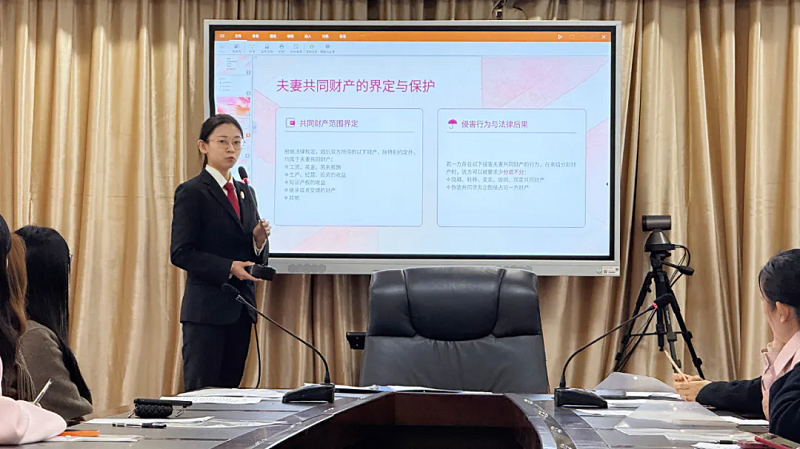 随后的普法讲座环节将活动推向高潮。安国市人民法院干警以“守护‘她’权益 绽放‘她’力量”为主题,为妇女代表们带来了一场内容翔实、贴近生活的法治课。在保障婚姻家庭合法权益方面,我院干警结合审判实践中的典型案例,详细讲解了夫妻共同财产认定、离婚损害赔偿、子女抚养权归属等法律规定,切实增强了女性在婚姻家庭领域的法治观念,让夫妻双方认识到婚姻扎根于相互尊重与共同责任之上。在保障职场平等权利方面,聚焦妇女平等就业权、同工同酬以及对女性特殊时期的法律保护等内容,指出任何形式的性别歧视和职场霸凌都为法律所不容,女性职工遇到劳动权益受侵害时,要敢于依法维权。在保障平等财产权利方面,清晰区分夫妻共同财产与个人财产,讲解财产继承、处置等关键知识,帮助妇女筑牢财产安全防线。整场讲座内容务实、语言通俗,将法律条文转化为易懂实用的知识,有效提升了妇女代表的法治意识和维权能力,获得现场一致认可。