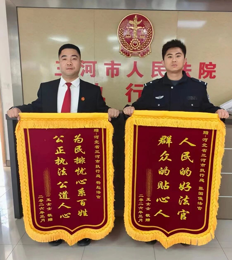“我知道自己当初违约不对,这笔债务就像块石头一直压在我心上,多亏法官耐心调解,既维护了申请执行人的合法权益,也帮我卸下了包袱,真的太感谢了。”近日,三河法院成功执行完毕一起民间借贷纠纷案件。被执行人王某将两面锦旗邮寄到执行人员手中,对执行人员耐心细致的工作表示衷心感谢。