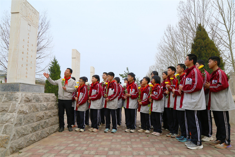 4月1日,平乡县第六中学学生在县革命烈士陵园聆听英烈故事。