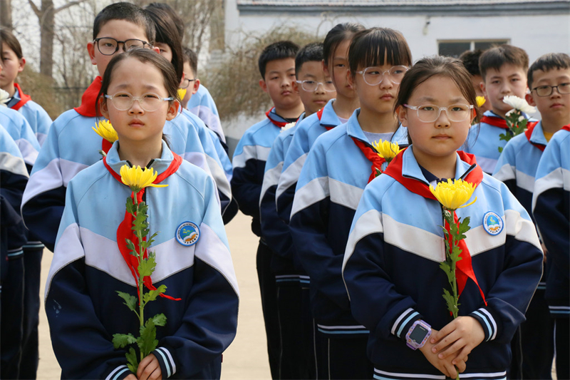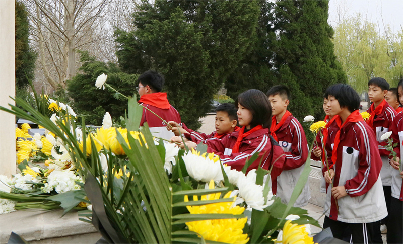 4月1日,平乡县第六中学学生在县革命烈士陵园向革命英烈献花。