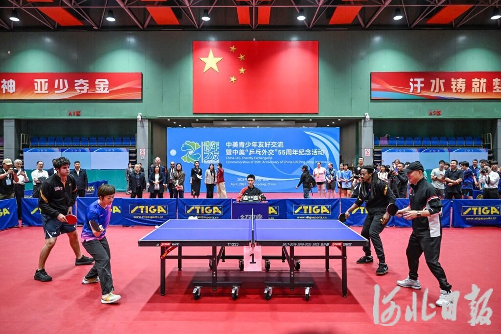 4月11日16时,一场友谊赛在河北正定乒乓球训练基地西训练馆进行。美国乒协会员阿齐兹·扎雷宾和卡梅伦·史密斯分别与河北名将牛剑锋、河北省乒乓球队教练杨广弟搭档,上演双打较量。发球、推挡、扣杀……乒乓球在桌上飞跃,引来阵阵欢呼声。随后,两国青少年运动员们拿起锅铲、文件夹作球拍,打起趣味乒乓球赛,现场笑声此起彼伏。