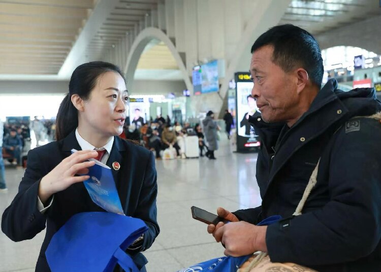 近日,石家庄铁路运输检察院联合石家庄铁路运输法院、北京铁路公安局石家庄公安处,在石家庄火车站开展宣传活动。候车大厅内,宣传人员发放《预防于心 反诈于行》手册,宣传防范电信网络诈骗知识。活动吸引广大旅客及车站工作人员积极参与,共发放手册近300 份,现场解答咨询40余人次。图为检察官在向群众普法。 马祎阳程雅靖摄