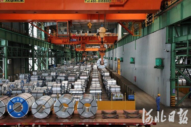 在首钢京唐钢铁联合有限责任公司冷轧作业部高强镀锌板成品库,运用大废钢比冶炼技术生产的钢卷正等待装车。河北日报记者王育民摄