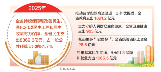 河北新闻网讯(河北日报记者贡宪云)夯实民生之本,增进民生福祉。从河北省财政厅获悉,2025年,全省持续保障和改善民生,强化20项民生工程和民生政策财力保障,全省民生支出8369.6亿元,占一般公共预算支出的81.7%。