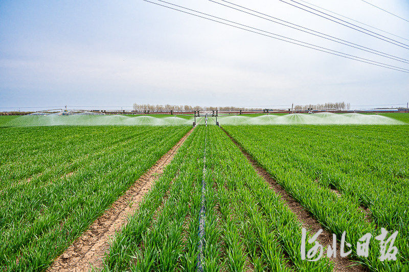 3月30日,唐山市开平区开平镇石泉庄村,自走式喷灌机正在给小麦浇水。河北日报记者郭宝强摄