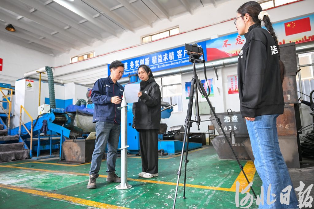 4月13日,位于邯郸市永年区的邯郸市浩盛紧固件有限公司生产车间,运营厂长程昊天(左一)在录制短视频。河北日报记者田明摄