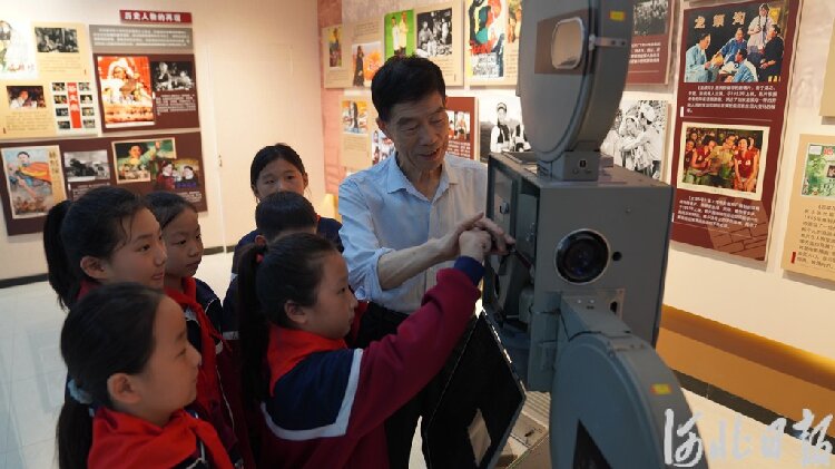 9月25日,魏少先为邯郸市丛台区滏阳学校学生讲解老式电影放映机使用方法。河北日报记者 刘剑英摄