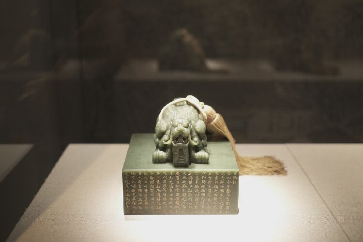 展柜中的清代乾隆皇帝所制“古稀天子之宝”玺印。(付旭遥摄)