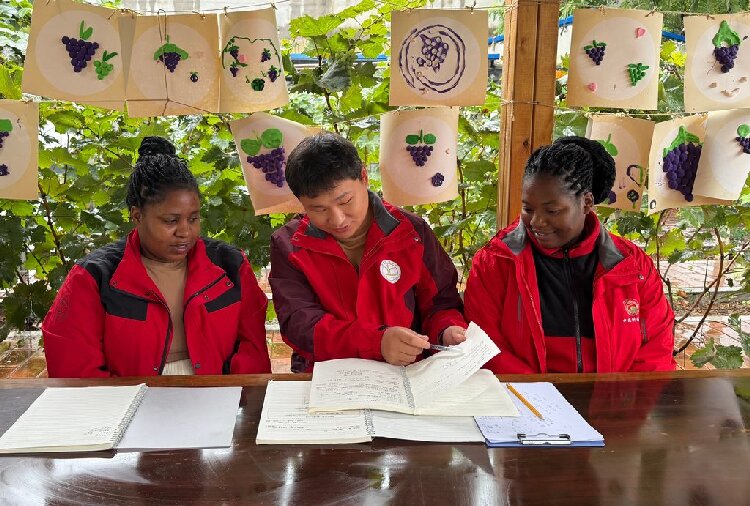 9月23日,曲周县前衙科技小院,中国农业大学硕士研究生佘宗港(中)与非洲留学生讨论“葡萄小镇”规划设计细节。中国农业大学供图