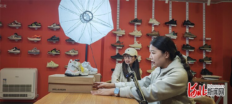 9月26日,位于雄安新区安新县三台镇的“三台鞋匠”品牌运营中心内,主播正在向网友介绍一款本地鞋企生产的休闲鞋。河北日报记者 曹 铮摄