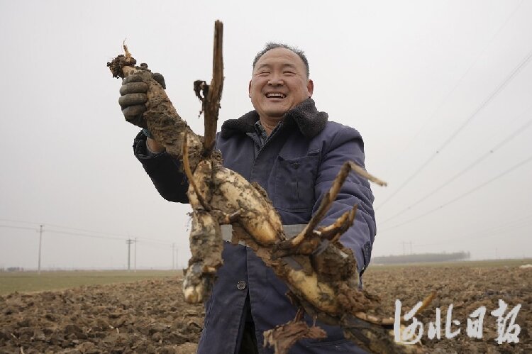 1月30日,隆尧县泽畔村张胜群的藕池内,藕农展示刚挖出的泽畔藕。河北日报记者闫德见摄