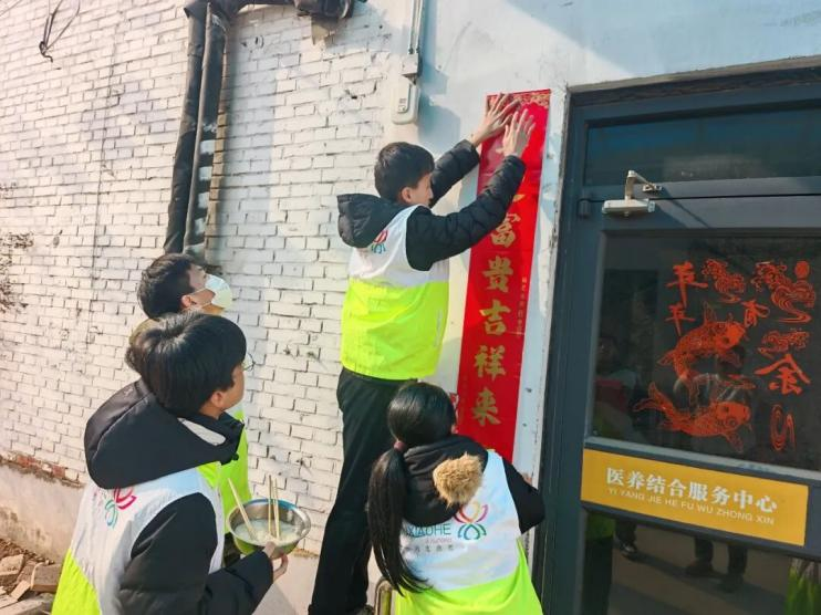 活动当天,衡水市赵圈养老院里,志愿者与养老院工作人员一同将春联、福字张贴在大门、楼道与活动大厅。