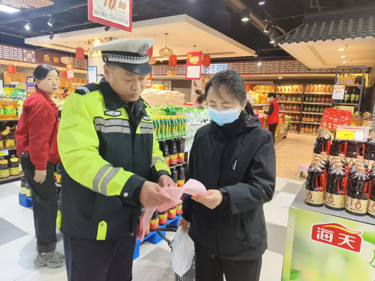 在商场,宣传交警通过发放宣传彩页、面对面宣传的形式,向超市工作人员和购物群众讲解了冬季安全出行知识,如何正确过马路、非机动车如何安全行驶、“一盔一带”、拒绝酒驾等知识,提醒广大群众自觉遵守交通法规,摒弃交通陋习,杜绝侥幸心理,提高安全防范意识,时时注意安全,时时不忘安全。