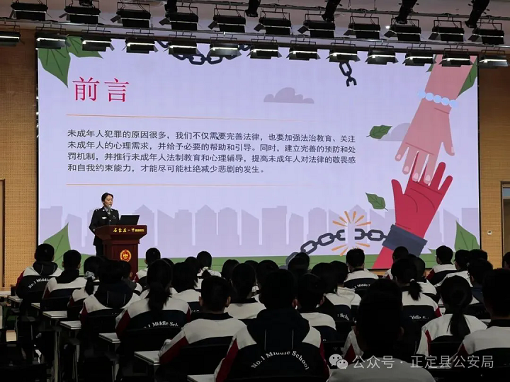 为强化青少年法治观念,提升自我保护能力,营造安全和谐的校园环境,近日,正定县公安局三里屯派出所走进石家庄一中雅郡校区,以“与法同行 护航青春”为主题,带来一堂聚焦“拒绝校园欺凌”的生动法治课。