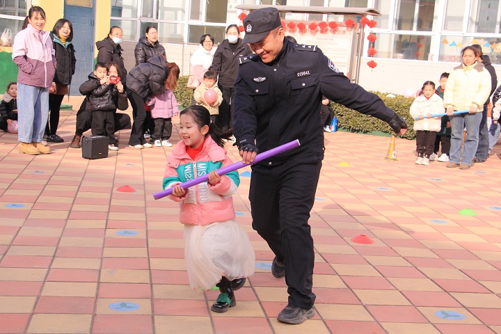 日前,石家庄市公安局井陉矿区分局组织民辅警走进辖区学校,开展了一场“警校一家亲 携手护平安”主题宣传活动。结合典型案例,民辅警为校方工作人员、幼儿家长详细讲解反诈、防范养老诈骗、禁毒等有关法律规定和安全知识,并与小朋友们展开亲切互动,通过趣味活动拉进警民距离。图为民警与小朋友进行趣味互动。 温彦文摄