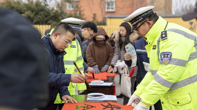 这是易县公安局交通管理大队联合易县文学艺术界联合会开展的“警民迎新年·春联话平安”主题交通安全宣传活动现场。在送出一份份“文化年货”的同时,交警们穿梭在人群中,开展面对面的交通安全宣传。他们趁着春节前夕人流集中的时机,想围绕节日出行特点再多嘱咐几句。