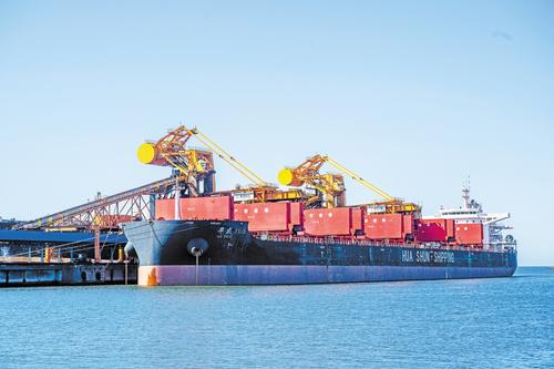 近日,货轮在秦皇岛港进行装卸作业。自《河北省港口污染防治条例》实施以来,秦皇岛港持续开展“翻、堆、取、装”全流程治理,绿色港口建设取得积极成效。记者 赵杰摄
