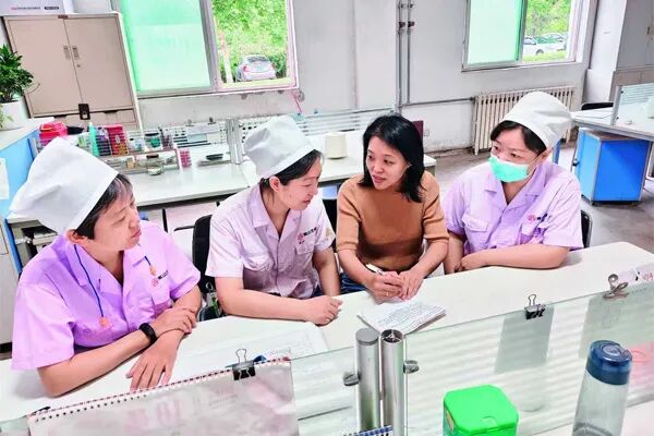 冯丽朝代表(右二)与工友们交流自己的操作经验和创新理念。(代表供图)