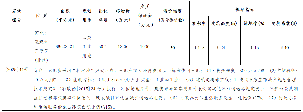 (一)[2025]41号地块按照“标准地”模式出让,执行“降地价”政策。竞买人需按照井陉县自然资源和规划局出具的工业用地拟出让“标准地”建设指标要求执行。