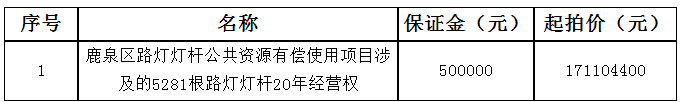 定于2026年1月30日9时40分在石家庄公共资源交易平台(https://www.sjzsggzyjyzx.org.cn/)对鹿泉区路灯灯杆公共资源有偿使用项目涉及的5281根路灯灯杆20年经营权进行公开拍卖(拍卖方式为网络电子竞价)。现将有关情况公告如下: