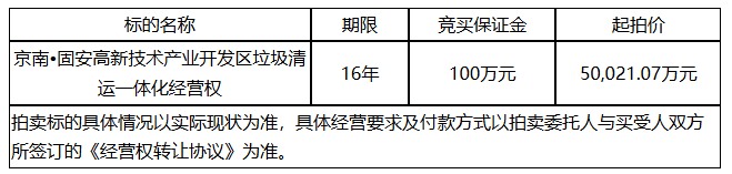 受委托,我公司定于2026年3月27日15时在固安县公共资源交易中心举行京南•固安高新技术产业开发区垃圾清运一体化经营权拍卖会。