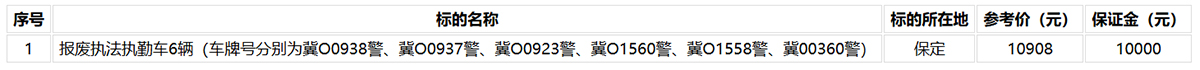 受委托,我公司定于2026年4月9日10:00在石家庄市石清路9号河北省公共资源大厦通过冀政政务服务拍卖平台(http://www.jizheng.org.cn/TPBidder-cs/tbrweb/index)公开拍卖报废执法执勤车辆6辆(车牌号分别为冀O0938警、冀O0937警、冀O0923警、冀O1560警、冀O1558警、冀00360警)。